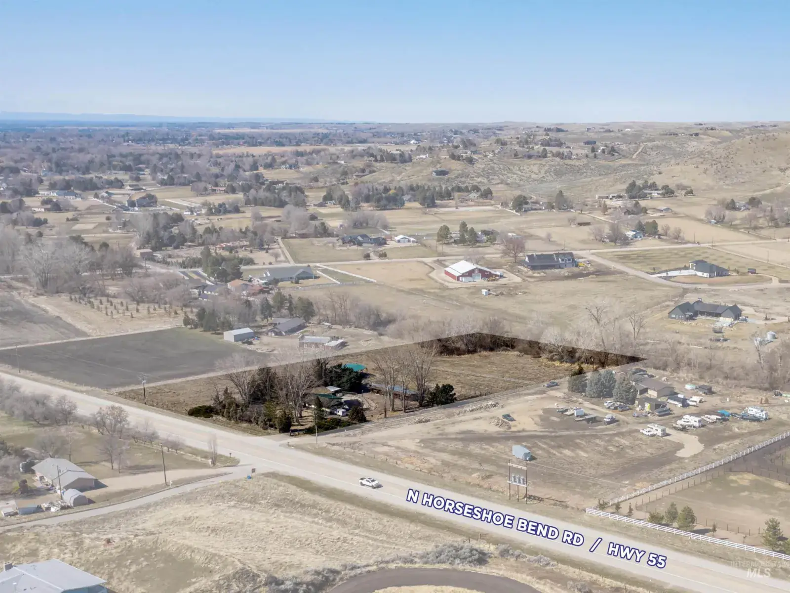 Rare opportunity for a small business, owner-user, investor, or developer to purchase sought-after acreage in the City of Eagle’s impact area. Seller willing to offer very favorable Seller financing. Many great possibilities for owner-users with traffic from the whole valley driving by! Ideas include contractor yard, garden/landscape centers, nurseries, animal boarding/kennels, equestrian uses, outdoor equipment storage, to name a few. Geothermal activity in area as well for spa/med use possibilities. Currently Ada County jurisdiction for desired business/development which has been proven favorable. Dry Creek frontage with rare surface water rights and irrigation system. Future land use is designated Mixed-Use Commercial in City of Eagle with exciting developments planned to north and south for future value! BTVAI