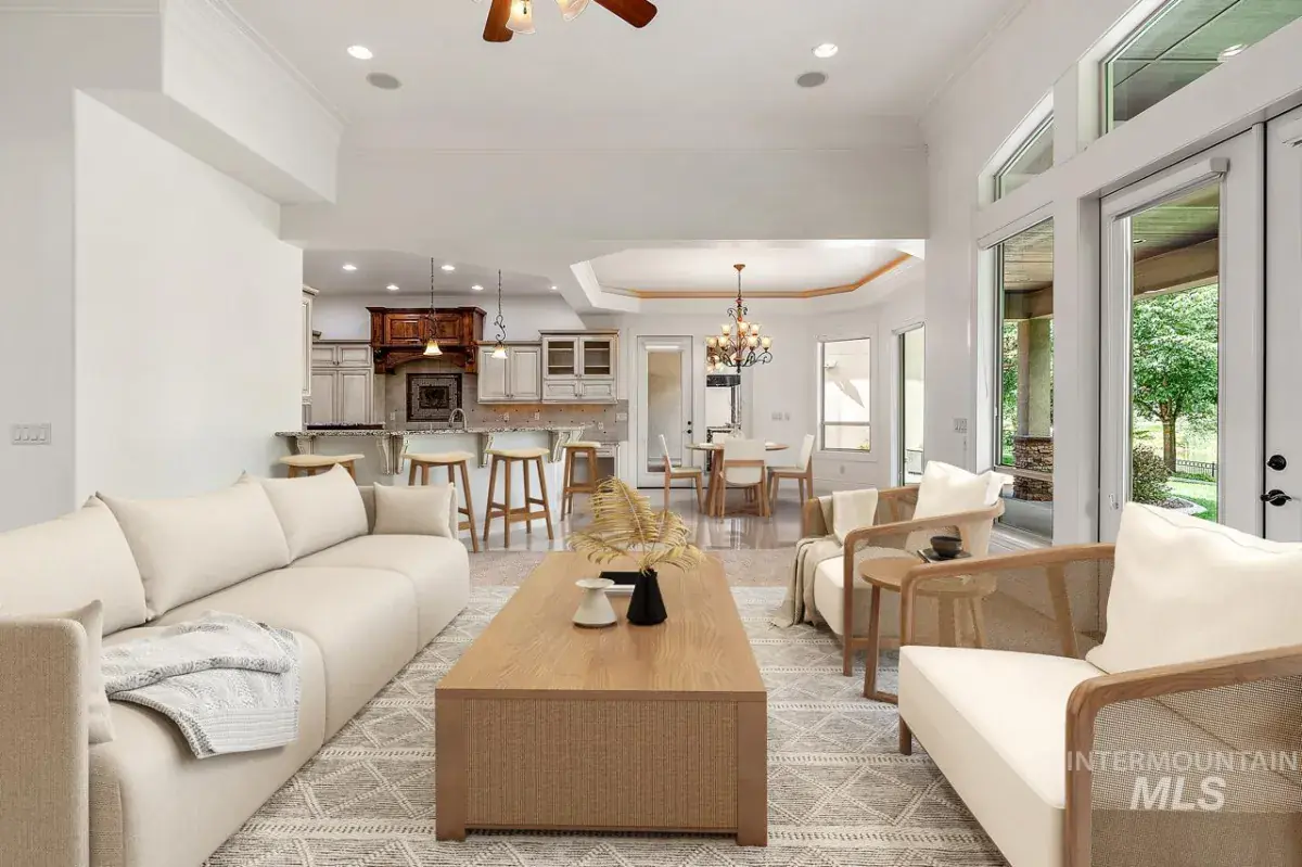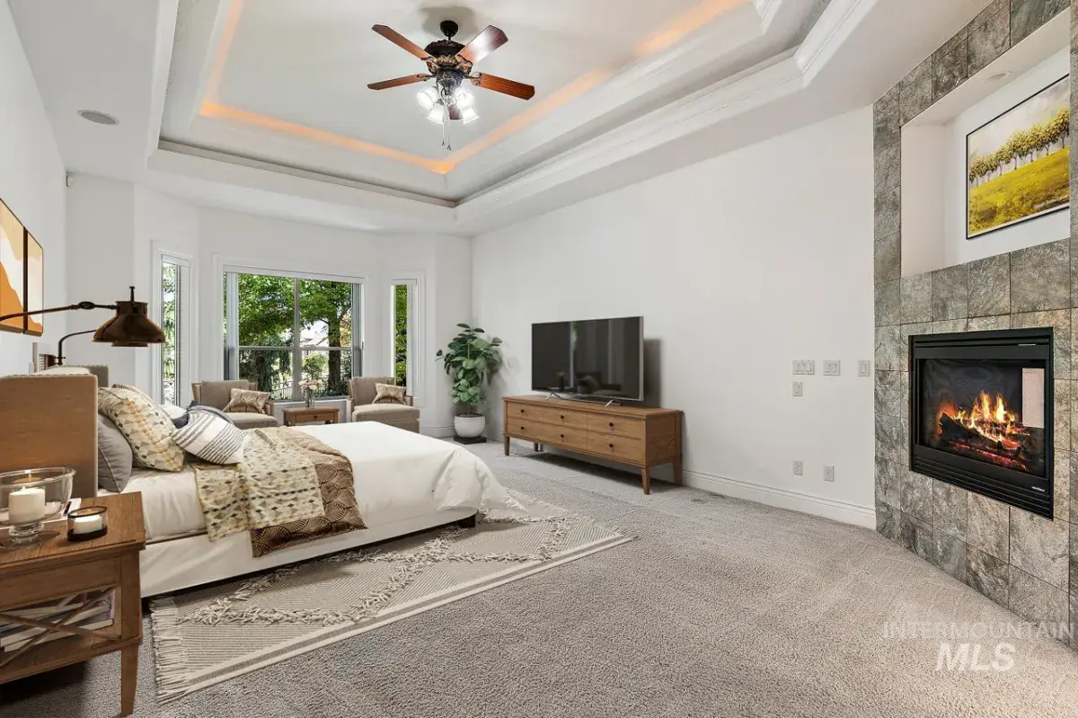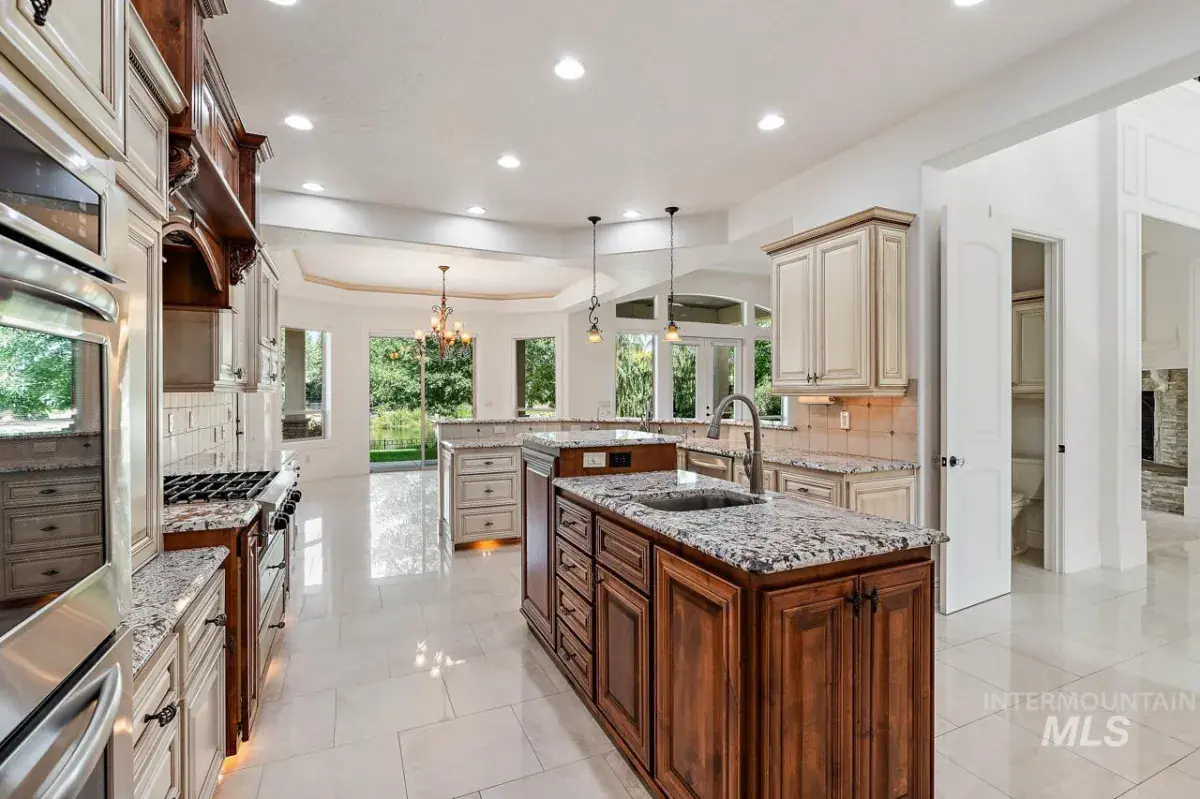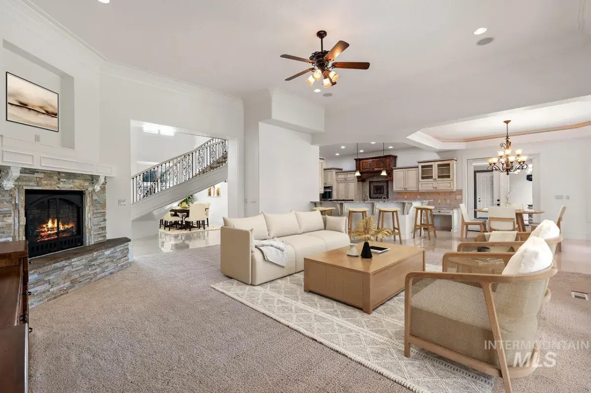 Listing Provided Courtesy of Silvercreek Realty Group at 208-377-0422Nestled along the Boise River in Two Rivers’ coveted enclave—The Shores—this masterfully crafted property meets your needs and fulfills your dreams in a private Eagle setting. Marvelously appointed, nearly 5,300 sq ft of enhanced lifestyle features grand entry and sweeping staircase, custom woodwork, vaulted ceilings, heated flooring, vast great room with fireplace; formal dining room, optional theater room, game room, entry-adjacent-office. Like the great room, the owners’ suite presents sweeping river views. It also features a double-sided fireplace, luxurious bath with heated floors, ample closets, & safe room. In the kitchen double ovens, prep sink, & walk in pantry delight chefs of all abilities, all with Kitchenaid appliances. The large RV garage welcomes your toys, and includes ALL the maintenance hookups. Mature landscaping enhances the gorgeous half-acre setting, and a private waterfall and full patio kitchen combine with all the benefits of Two Rivers life, to make this a home a haven.